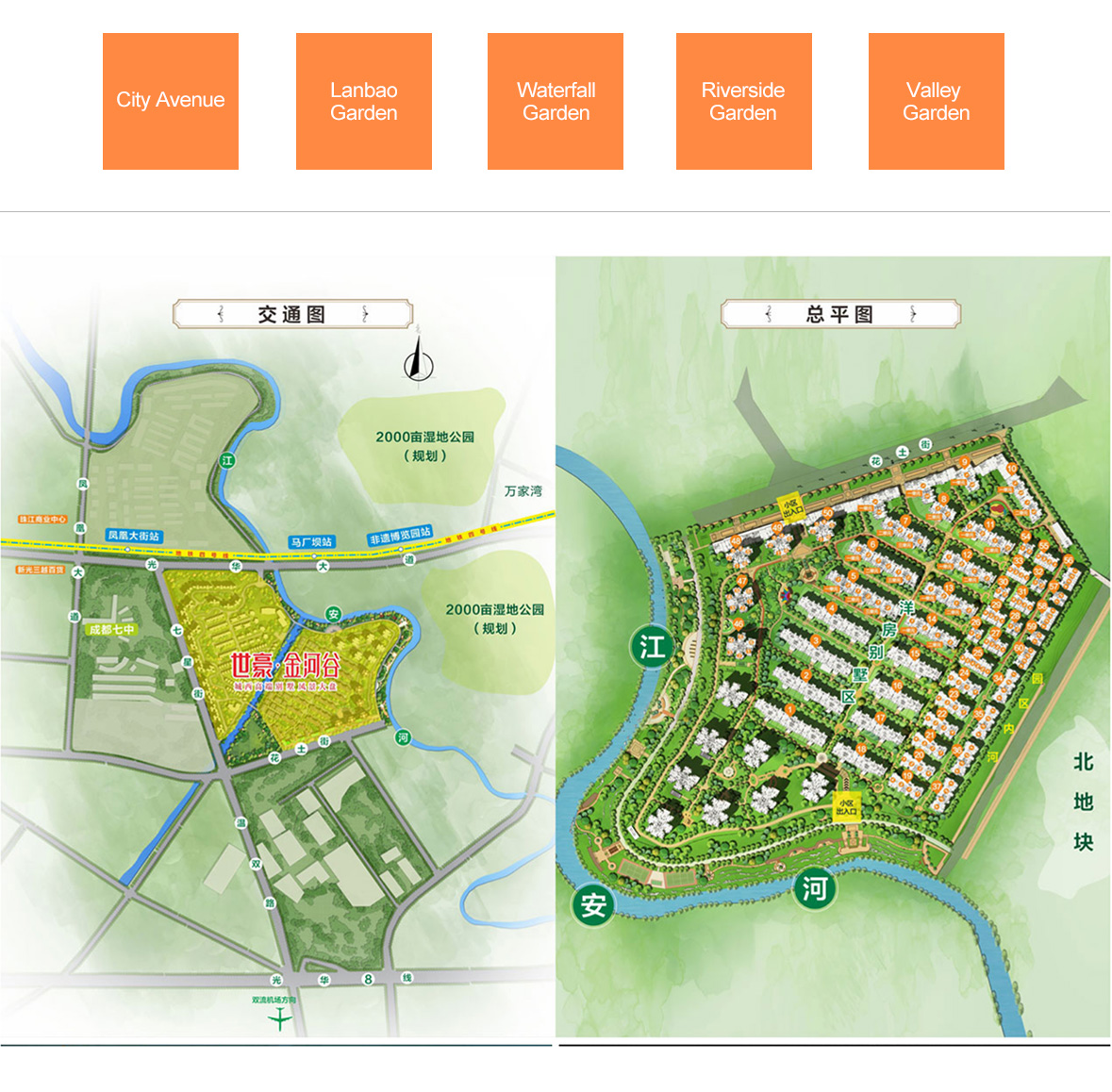 Golden Valley is next to Guanghua Avenue in the north, Huaxing South Road (under planning) in the south, opposite to Chengdu No.7 High School through Qixing Road in the west, and Jiang’an River in the east.